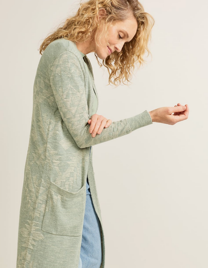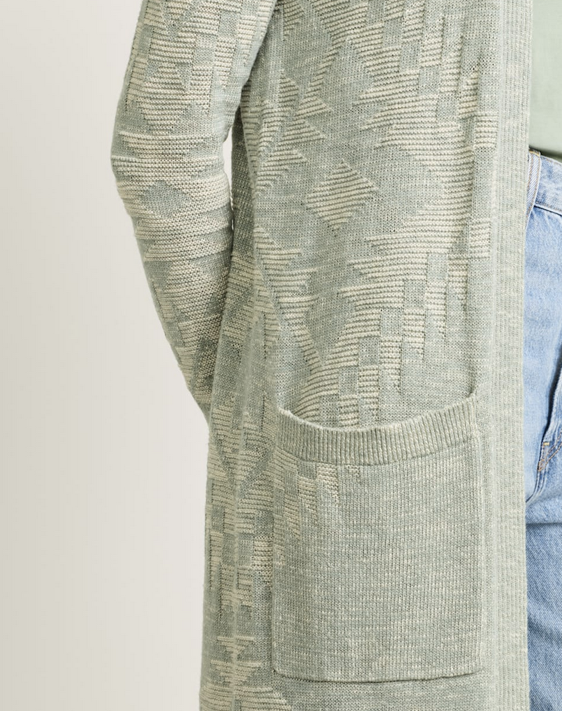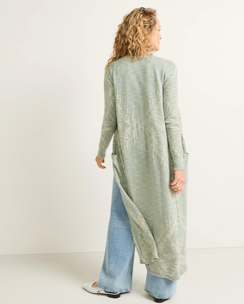 A modern essential with timeless appeal, this long, open-front duster features ribbed detailing at the placket, cuffs, and pocket openings for subtle structure, plus two convenient patch pockets for added function. The allover tonal knit design is thoughtfully placed across the sleeves, front, and back, creating texture and depth that elevate this versatile layer. This cotton duster sweater drapes beautifully over dresses, denim, or tailored pants, making it a go-to piece for casual weekends, office layering, or travel. Shop local at Tumbleweed Boutique on Alberta Street in Portland, Oregon or shipped to your door in a few days.